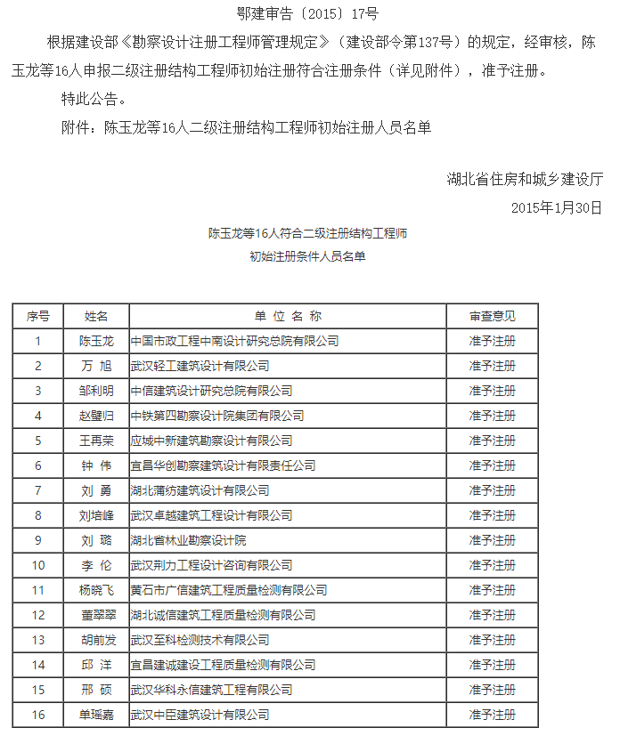 关于2015年第一批二级注册结构工程师初始注册人员名单的公告